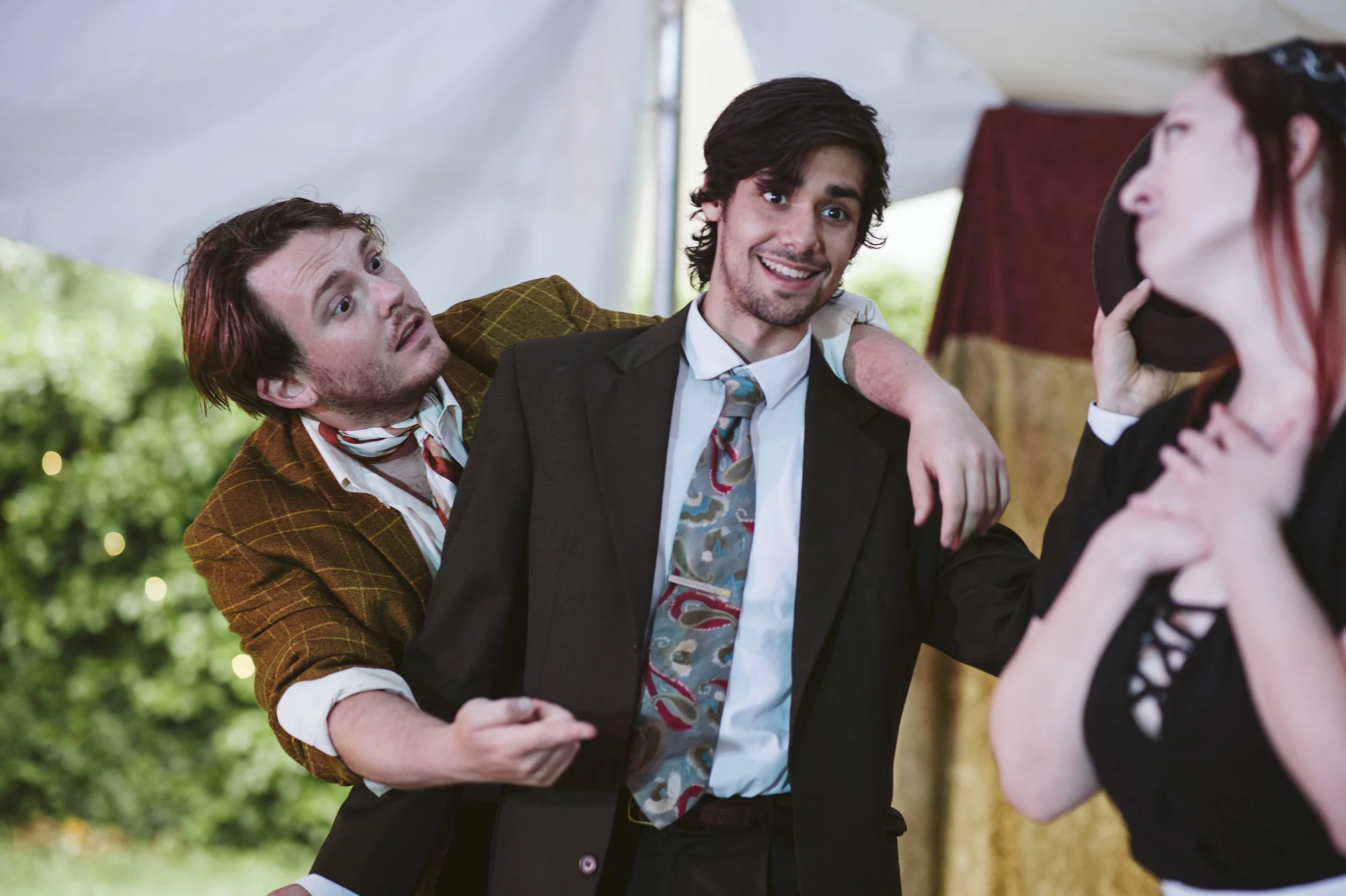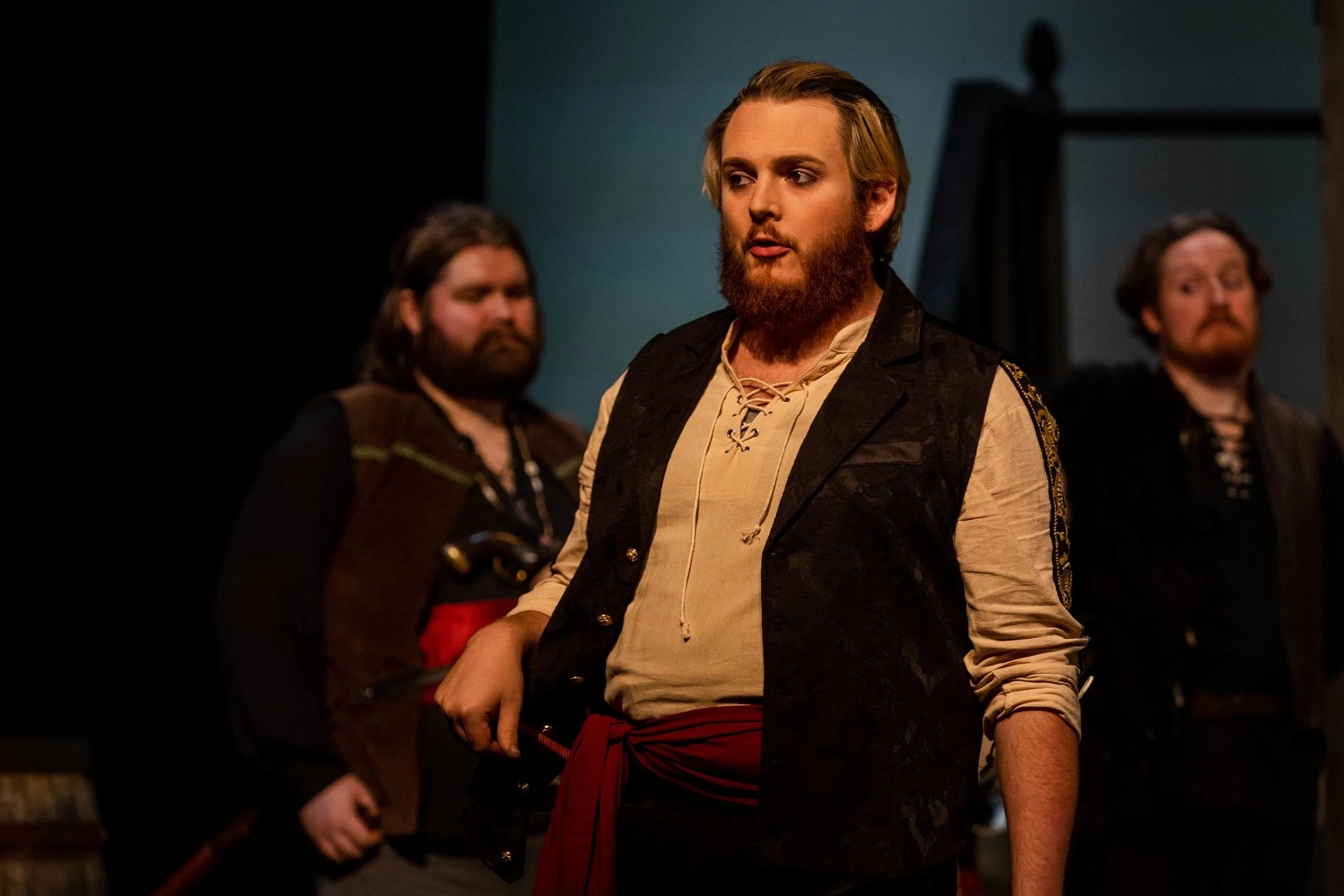 Scene from a theatrical performance with three men in period costumes, including vests and tunics, on stage.