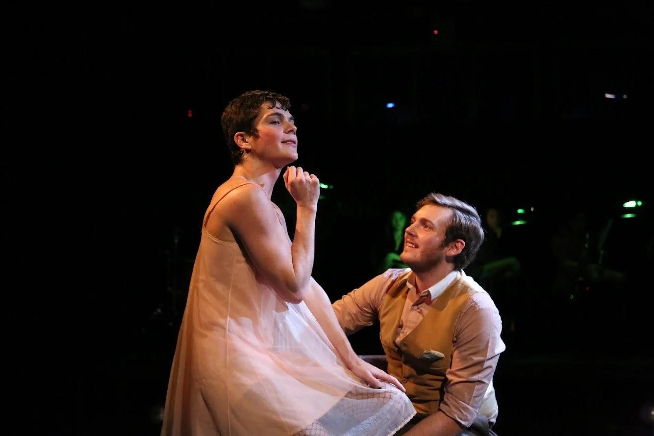 Two actors performing on stage, one in a dress and the other in a vest, with dim lighting and a dark background.