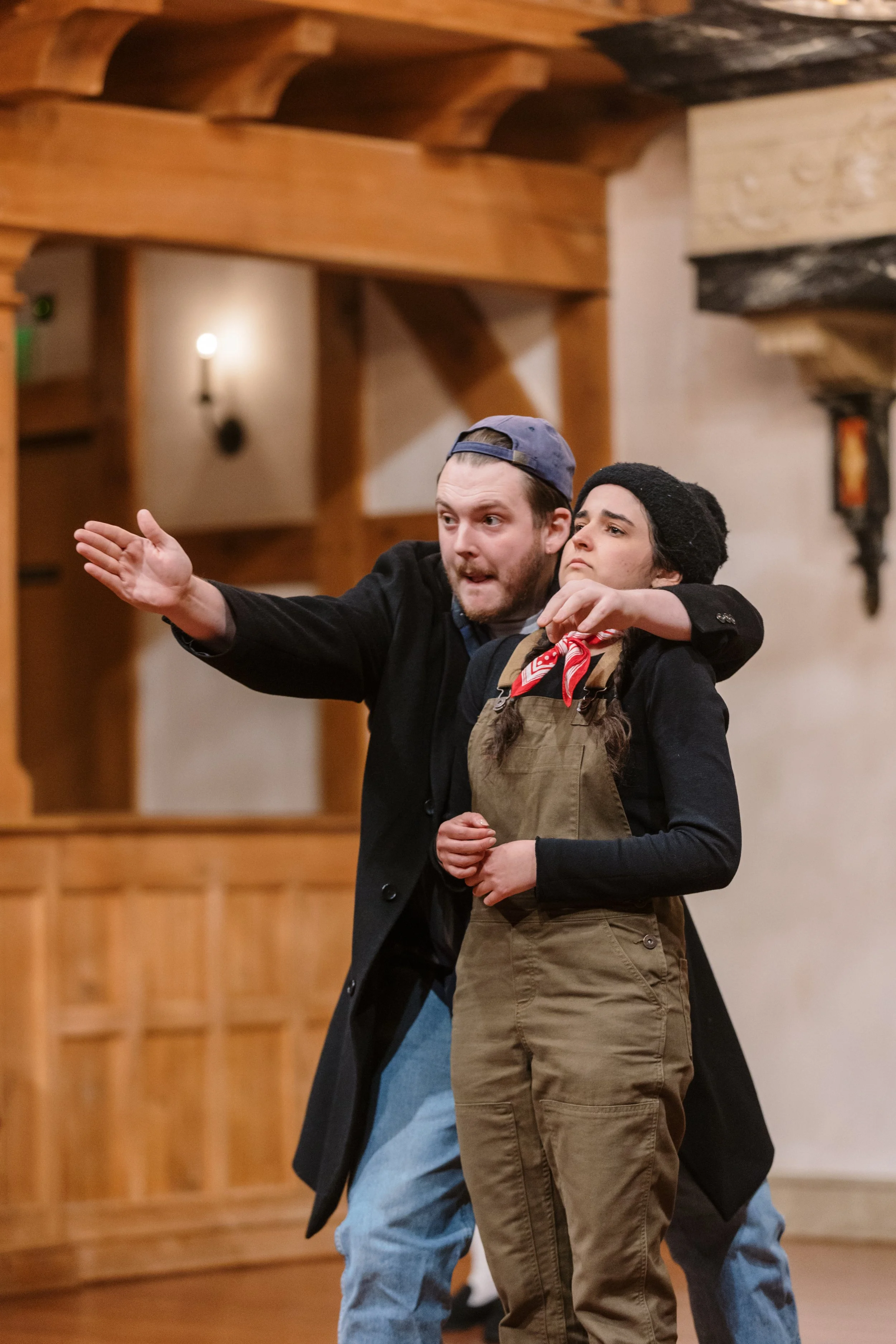 Two people performing on stage, one in a jacket and cap holding the other in overalls close, with gesturing hands.
