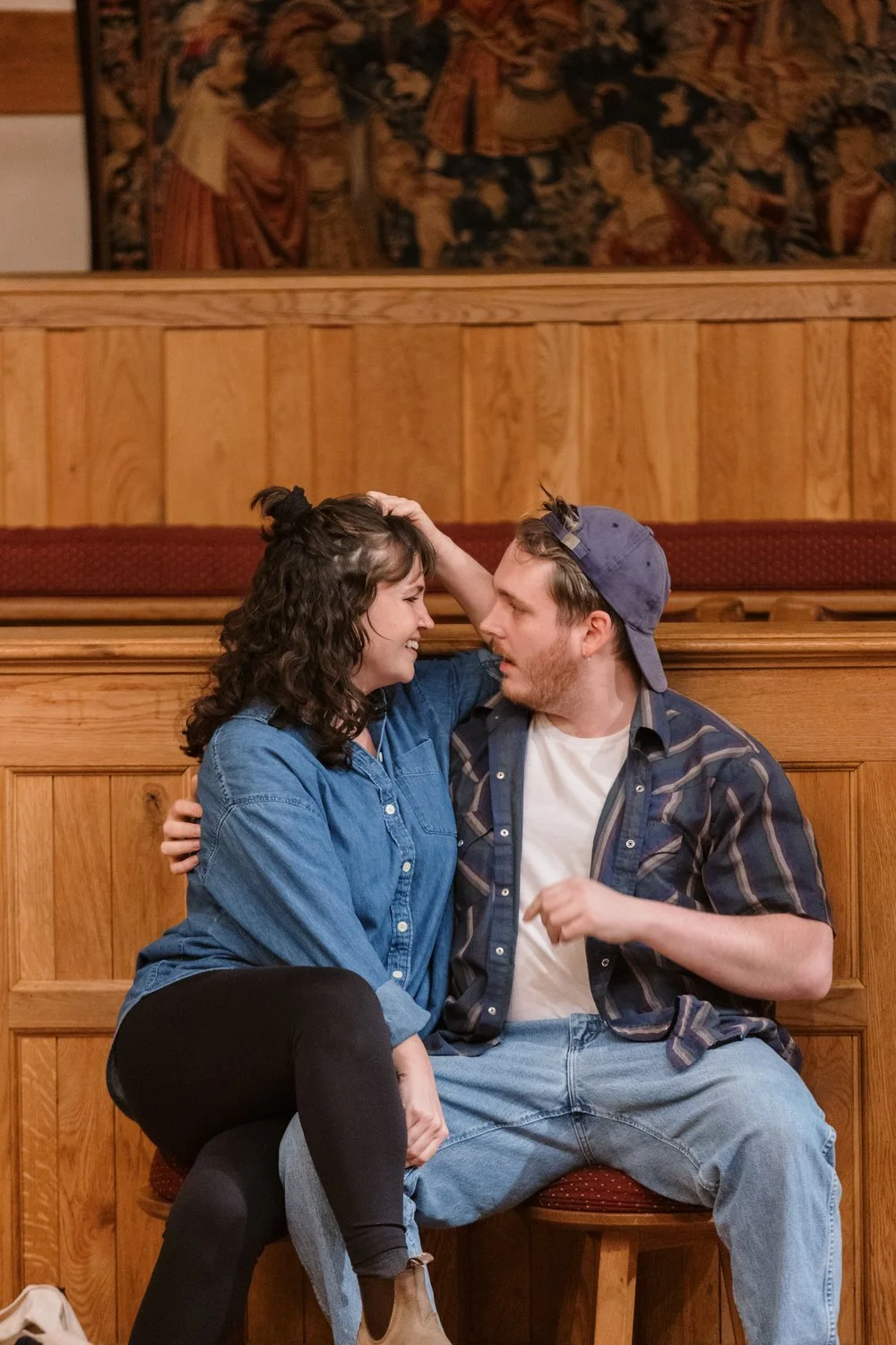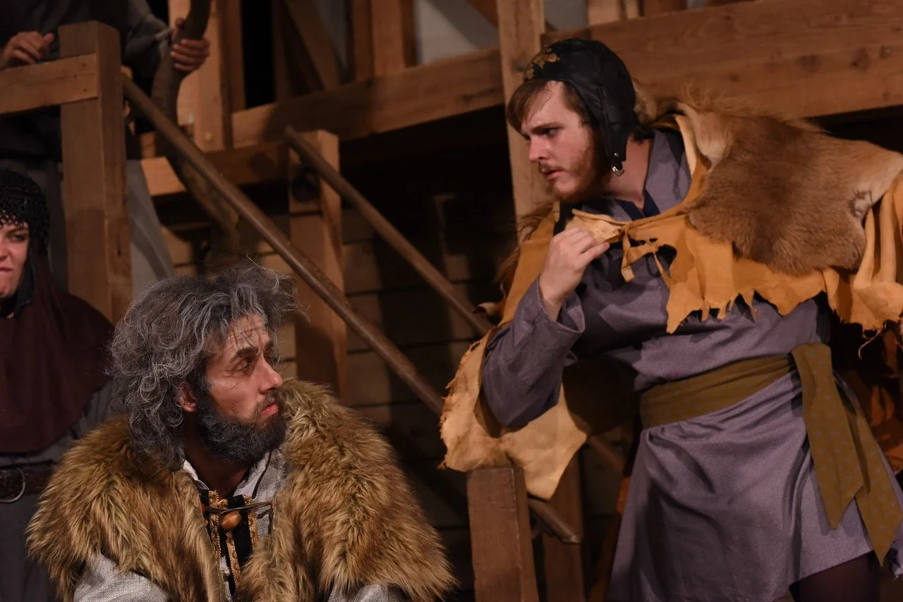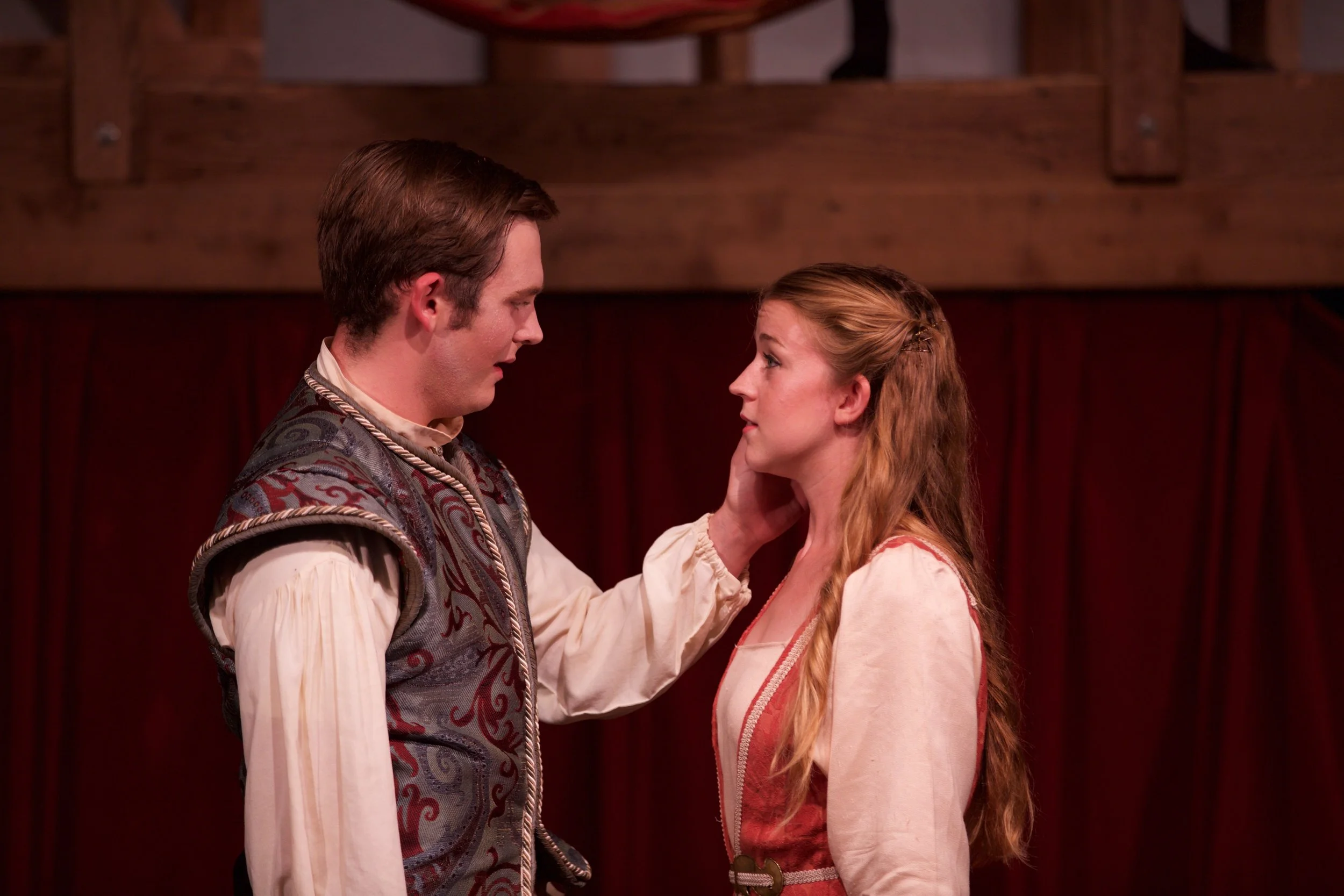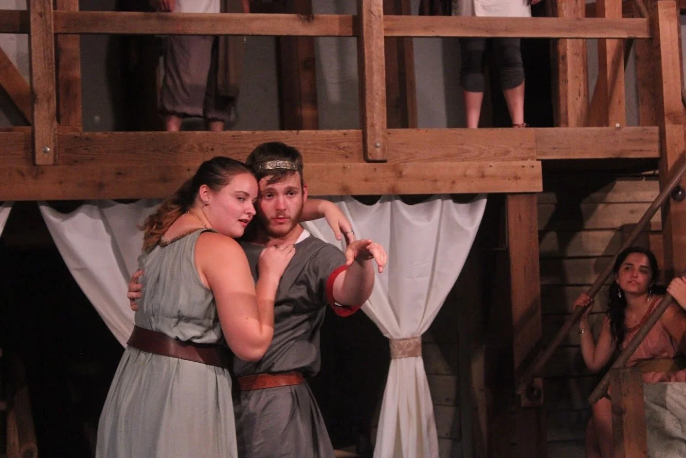 A stage performance with two actors in medieval costumes embracing. The man points off-stage while wearing a circlet on his head. The setting features wooden structures and draped fabric. Another person is visible in the background seated on stairs.