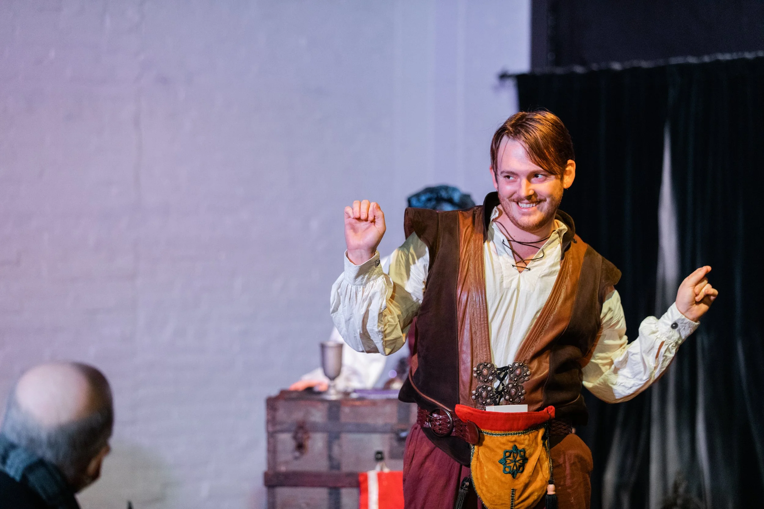 Man in medieval costume performing on stage with a smile, in front of an audience member. Background consists of a chest and curtain.