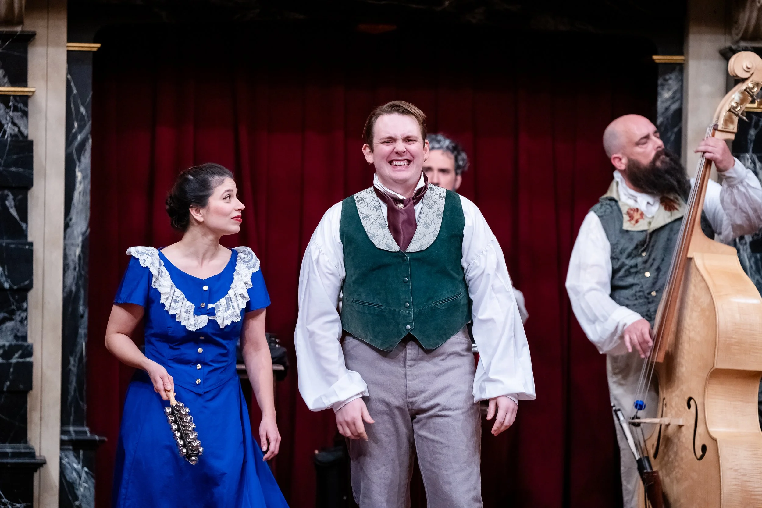Actors in vintage costumes performing on stage, one holding a tambourine, another playing a string instrument.