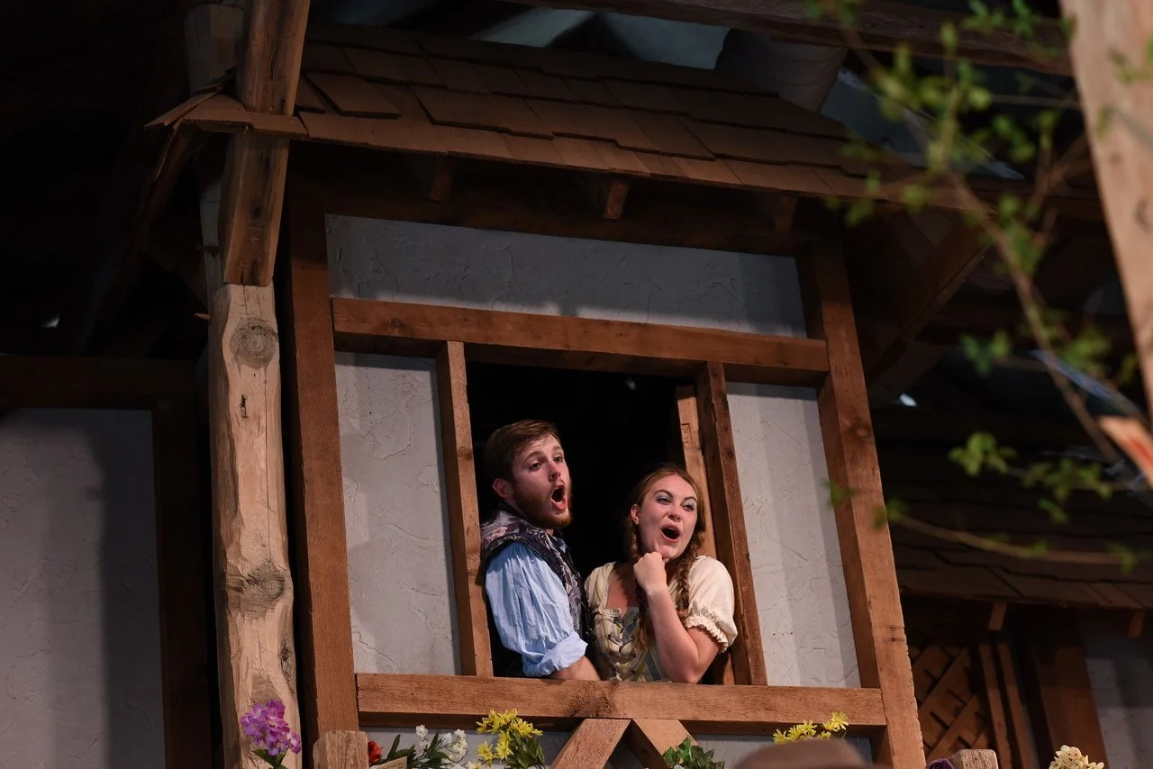 Two people in medieval costumes singing at a wooden window during a stage performance, surrounded by flowers.