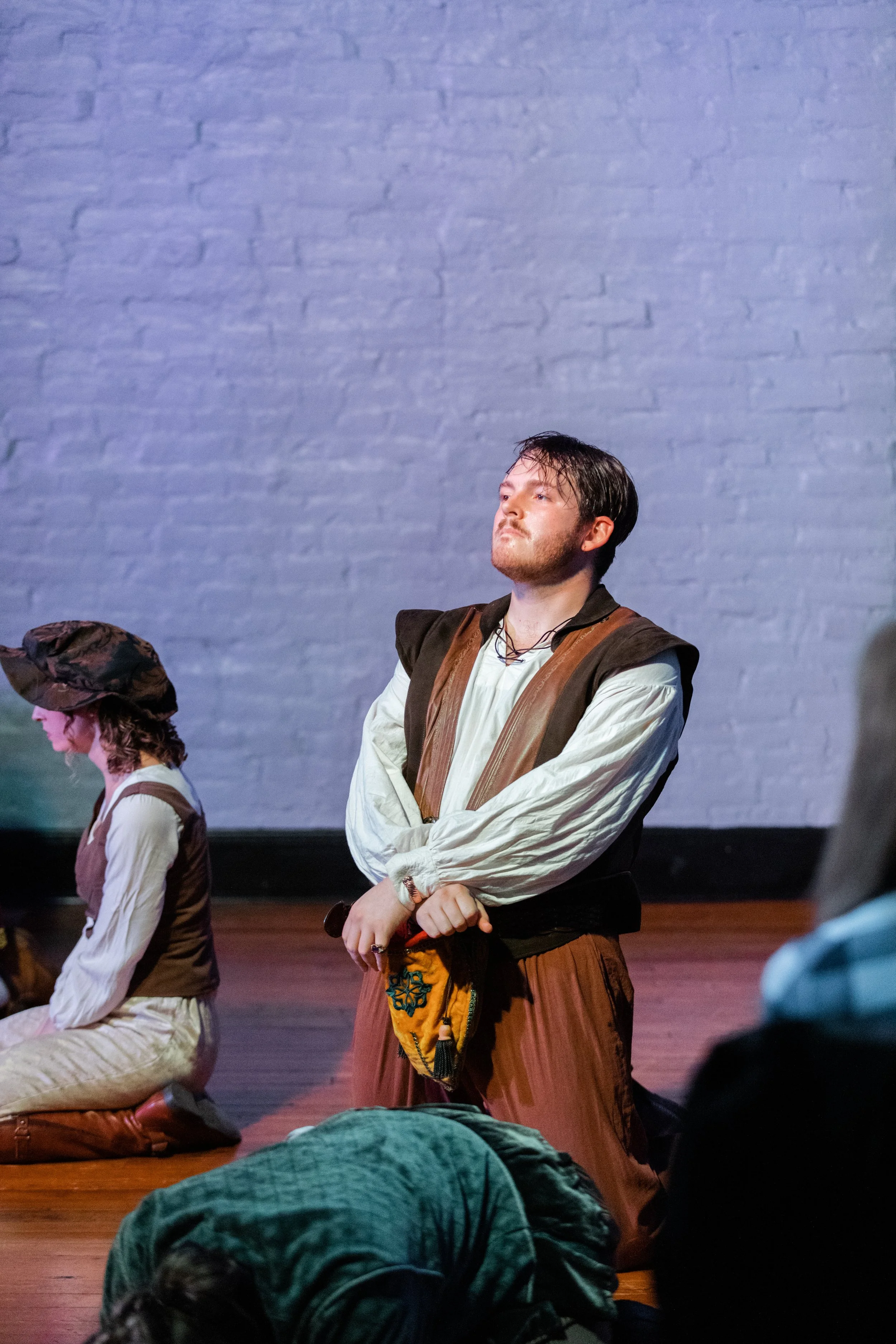 Person kneeling in period costume on stage during a theater performance.