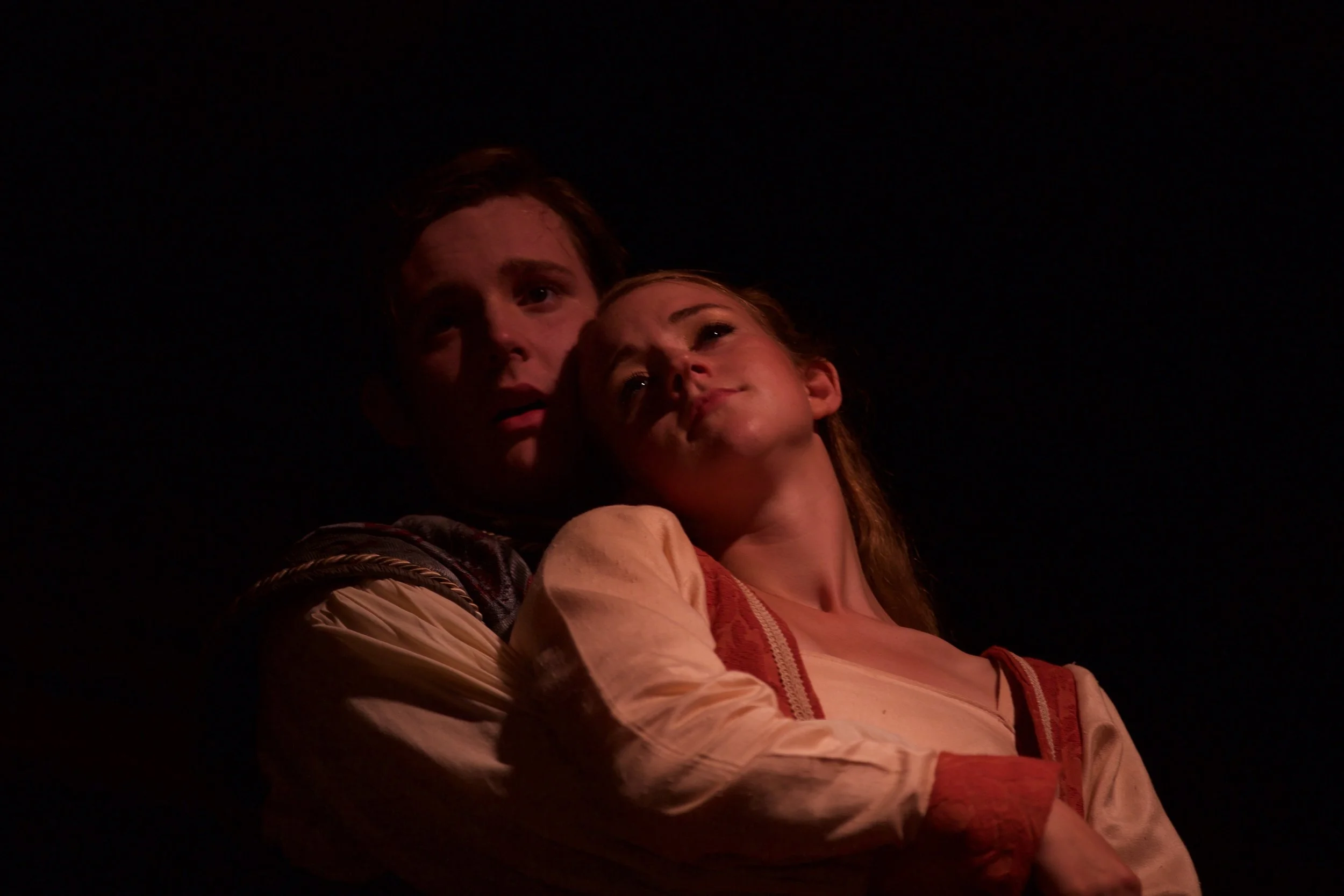 Two actors on stage in dramatic lighting, embracing, wearing historical costumes.