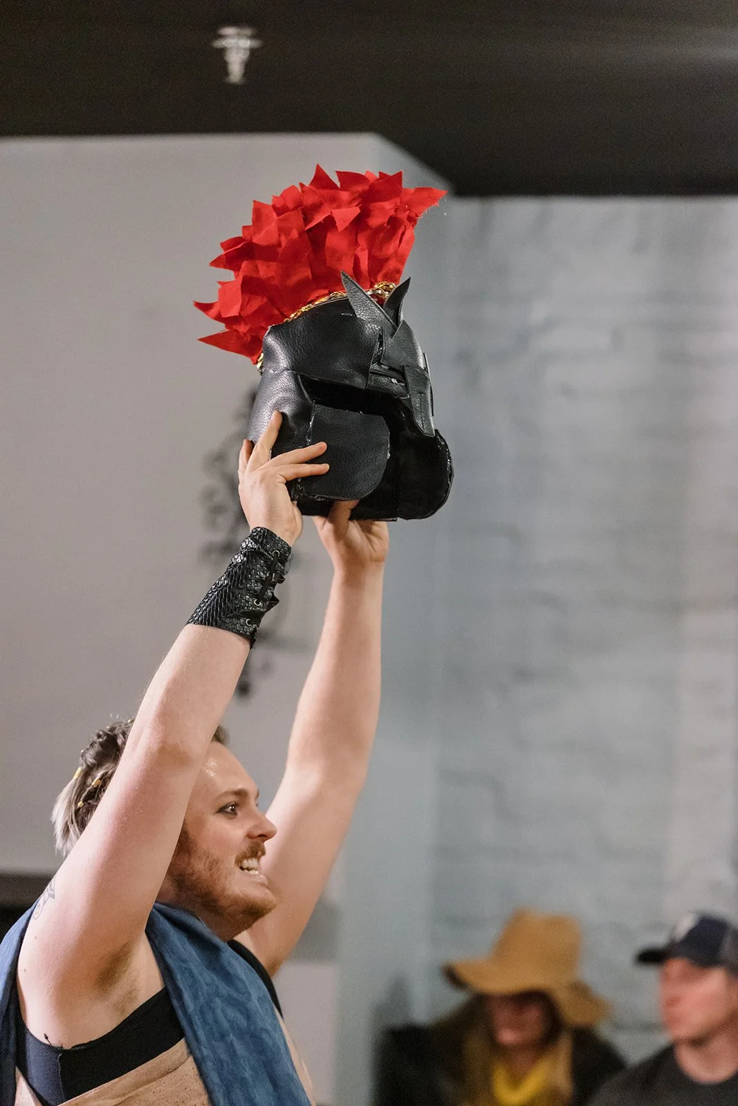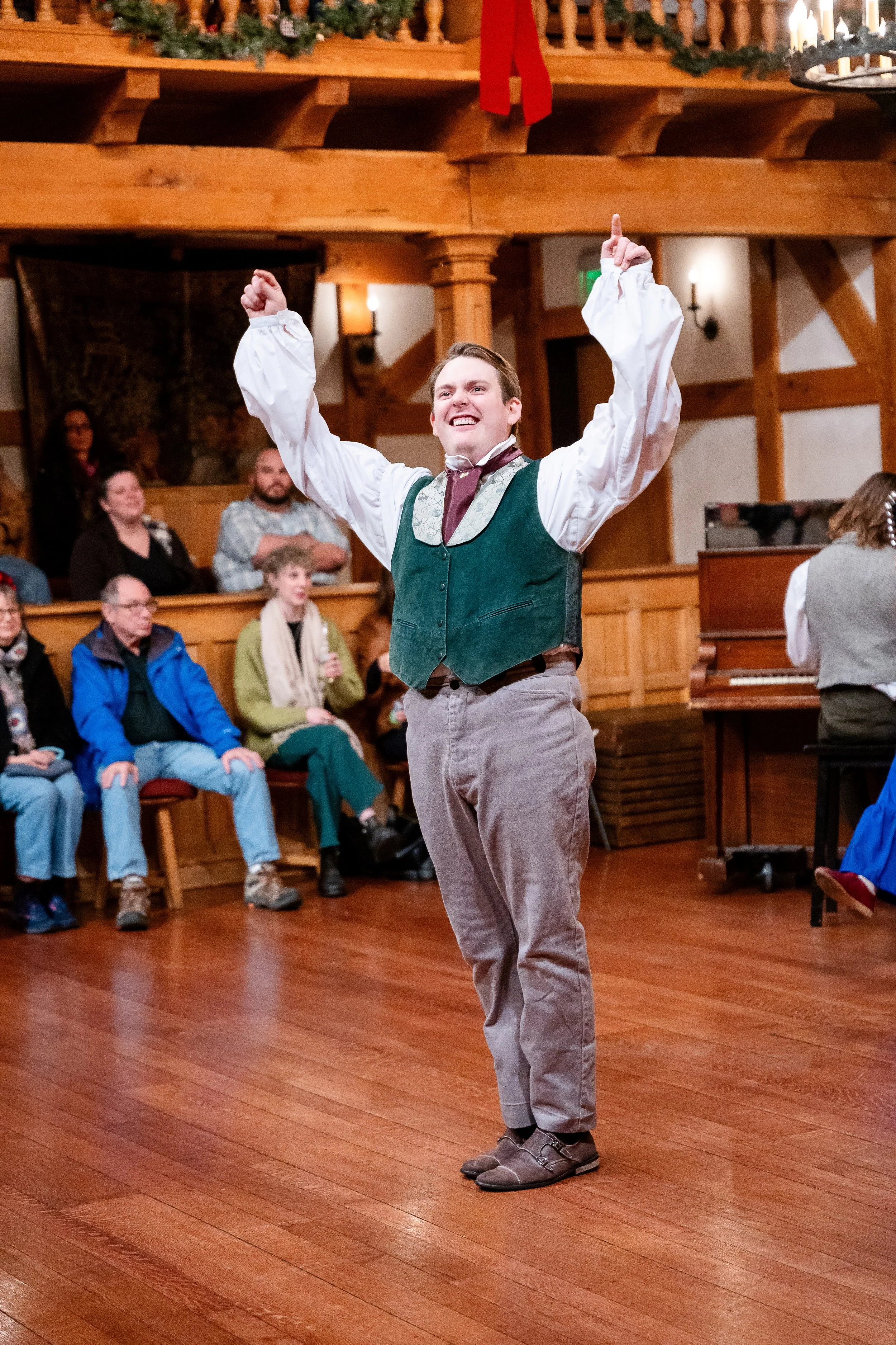 Person in historical costume performing on stage, wearing a blue vest and gray shirt.
