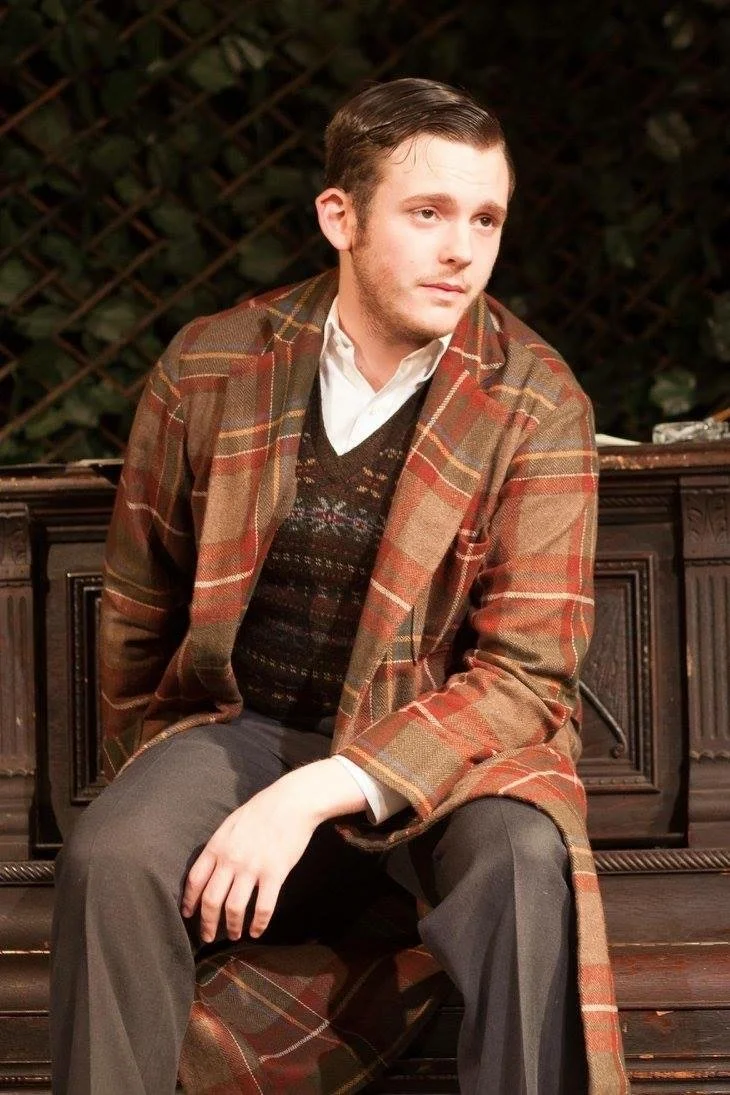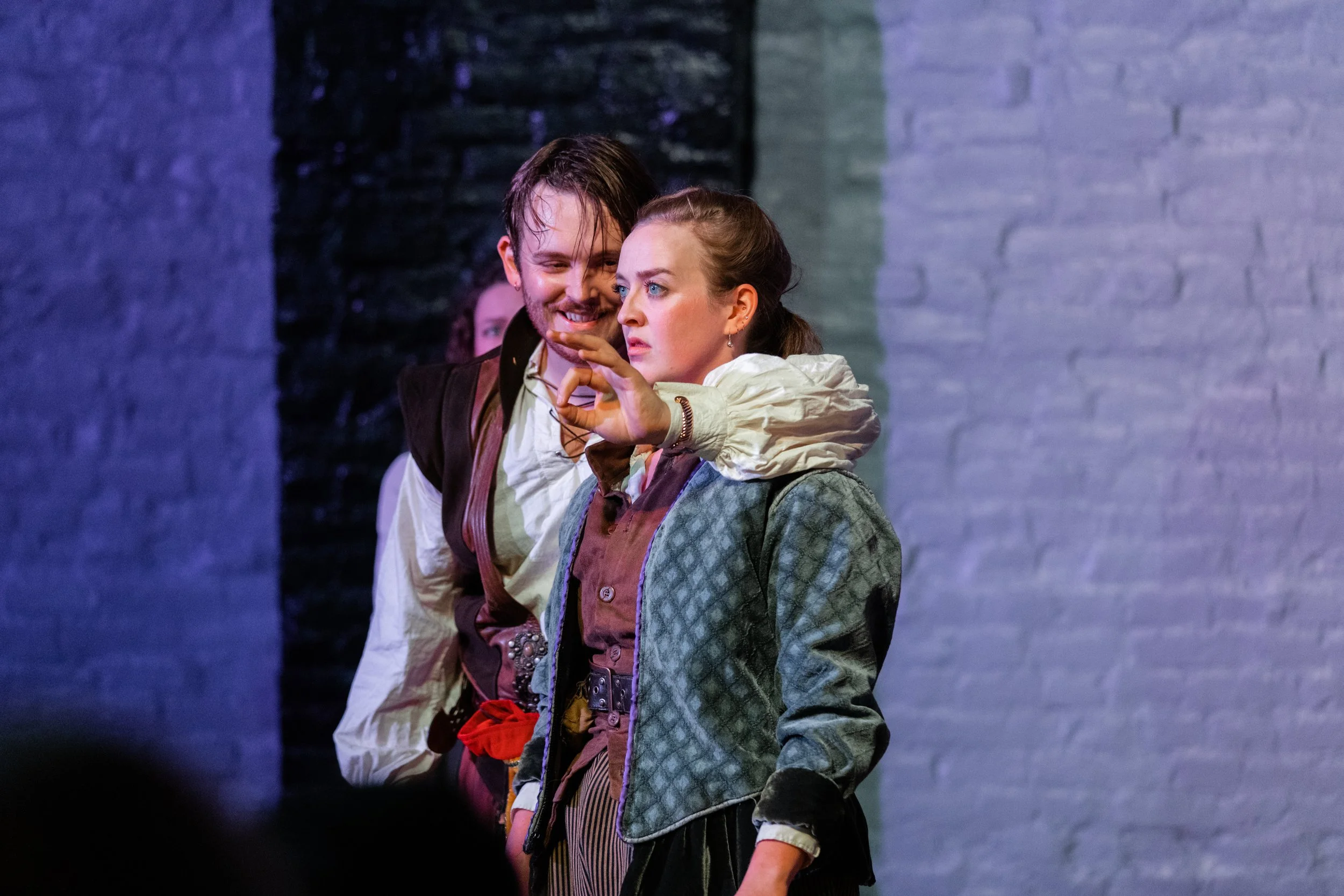 Two actors performing on stage in period costumes with a brick wall backdrop.