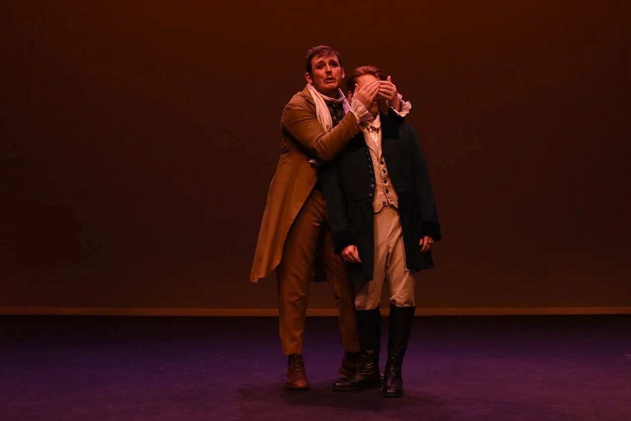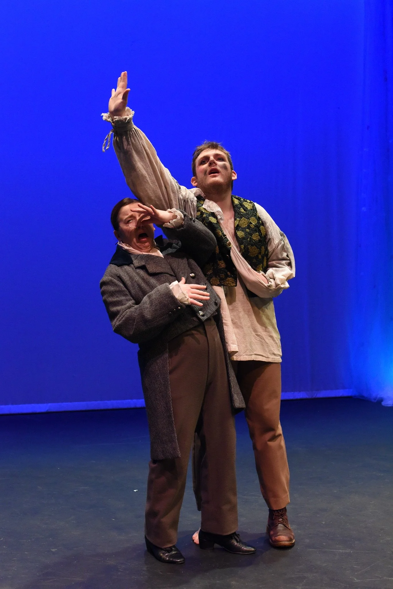 Two actors performing on stage in historical costumes, one covering the other's eyes.