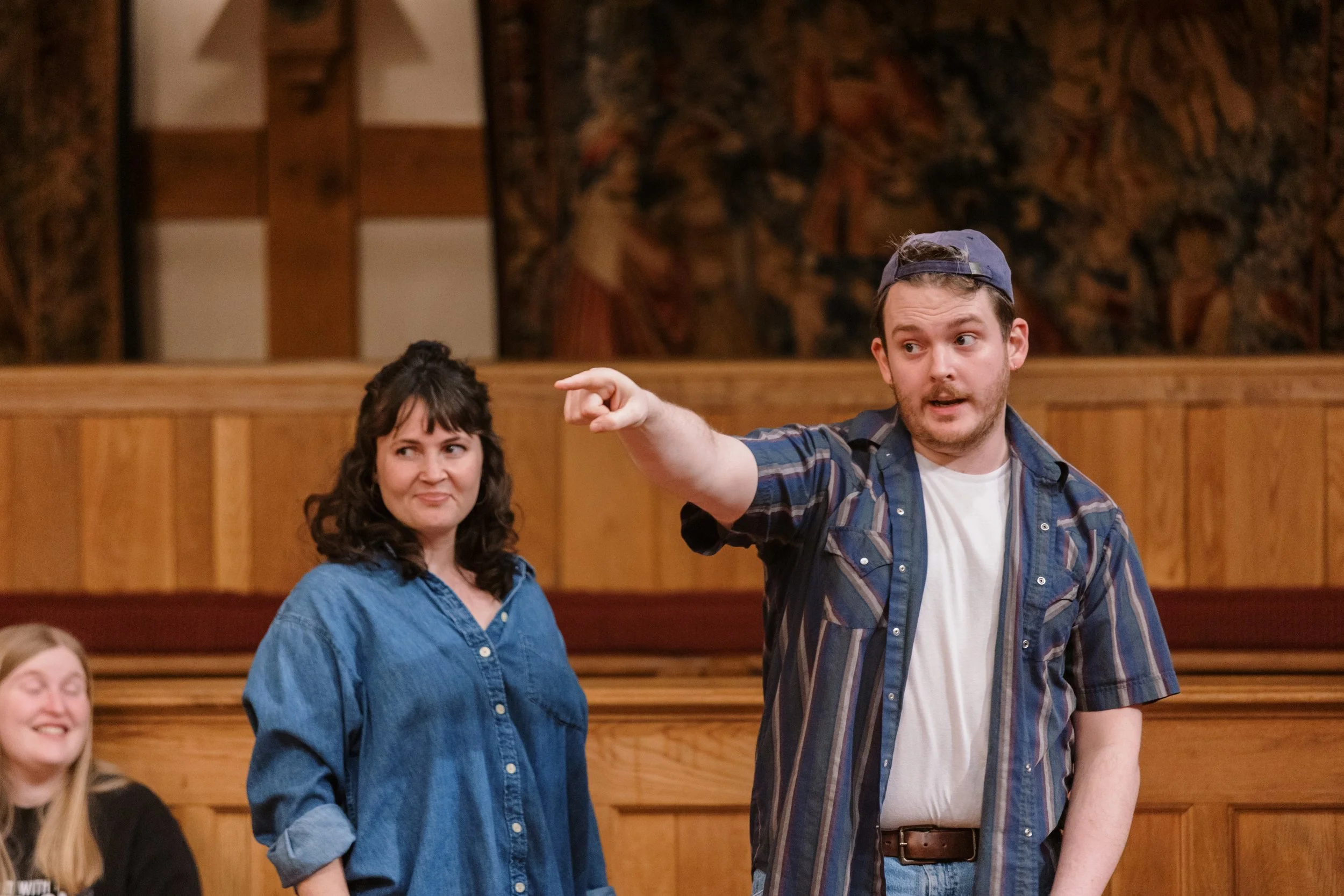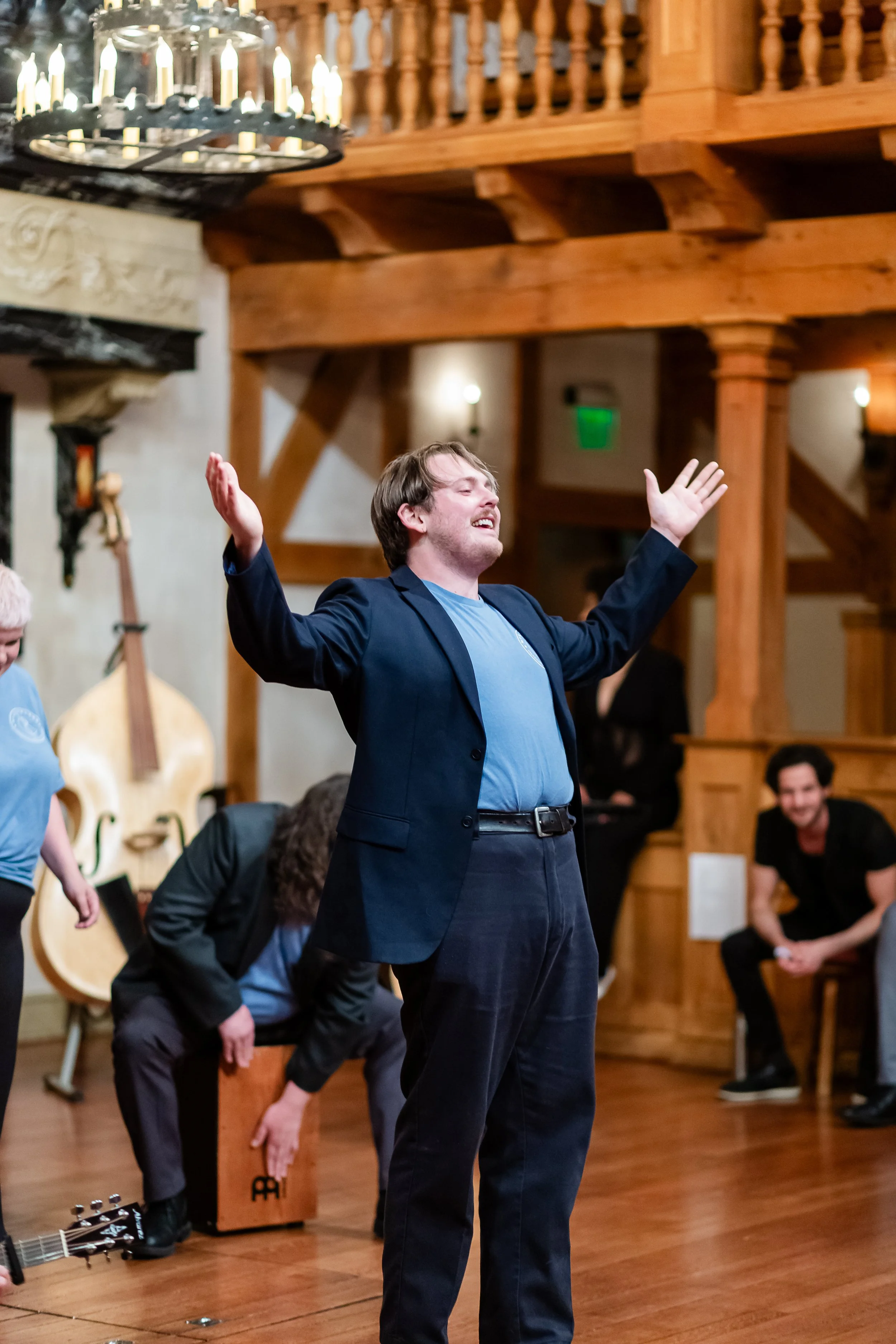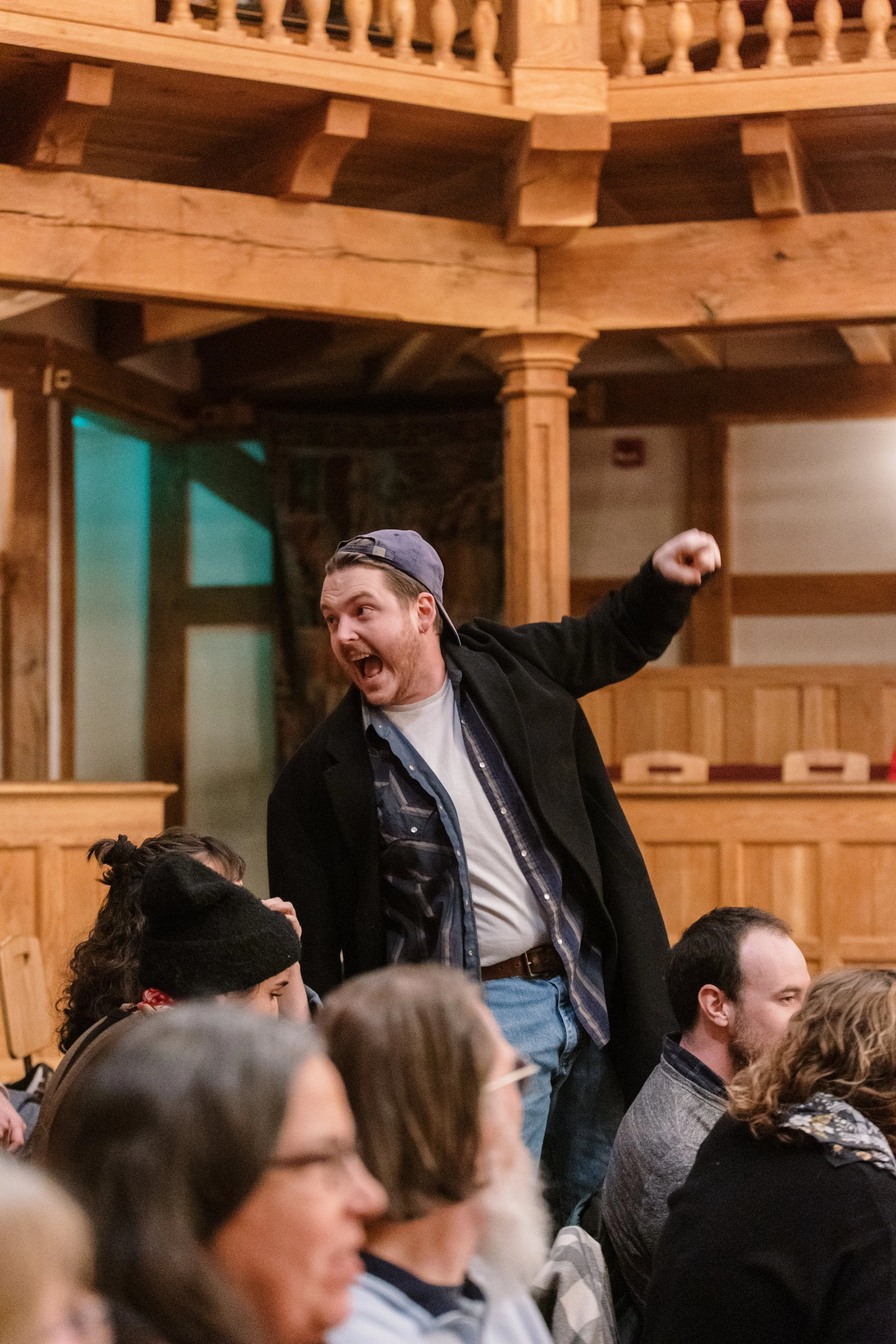 A person in a casual outfit energetically gestures in a wooden theater setting.