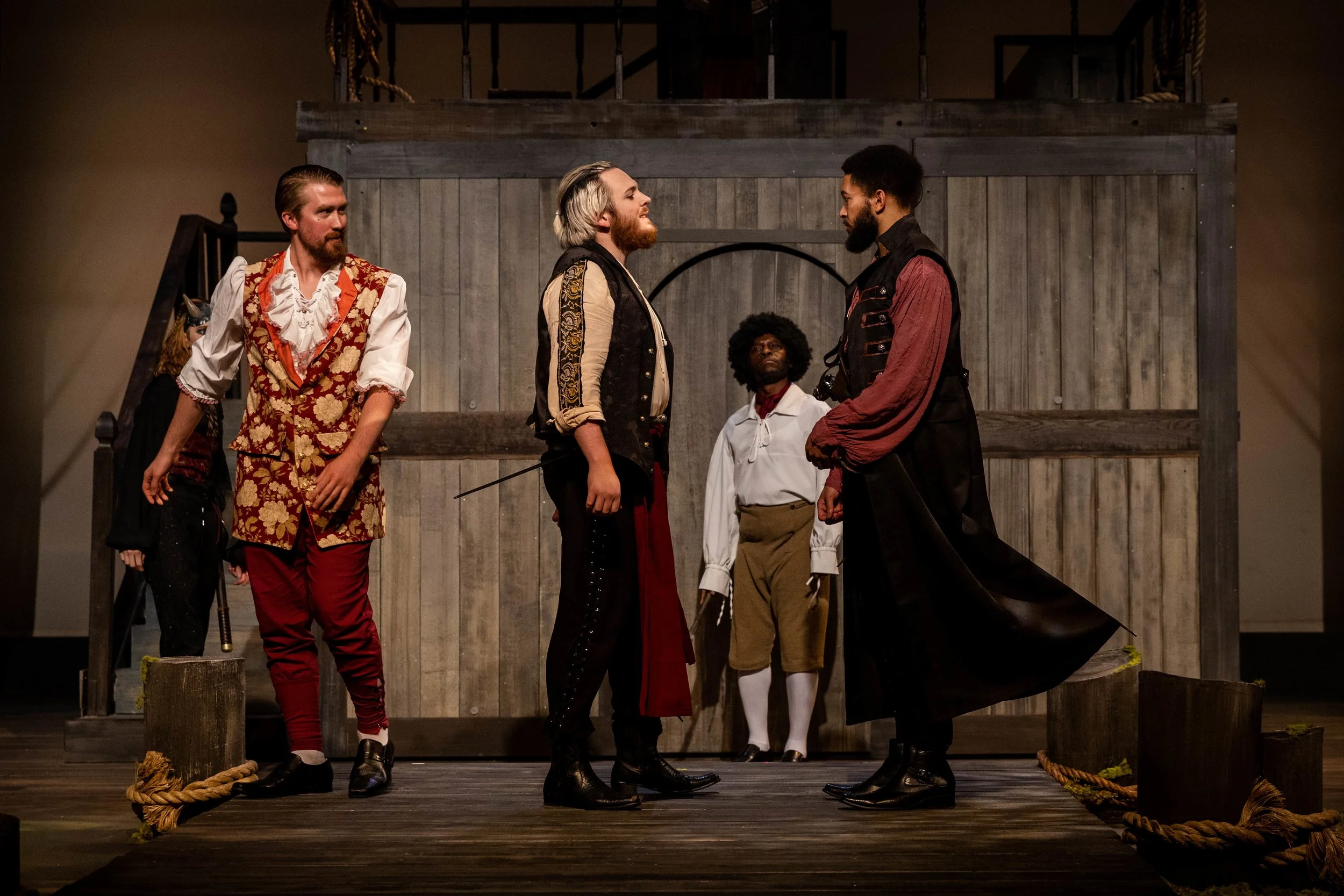 Theatrical performance with actors in period costumes on a wooden stage.
