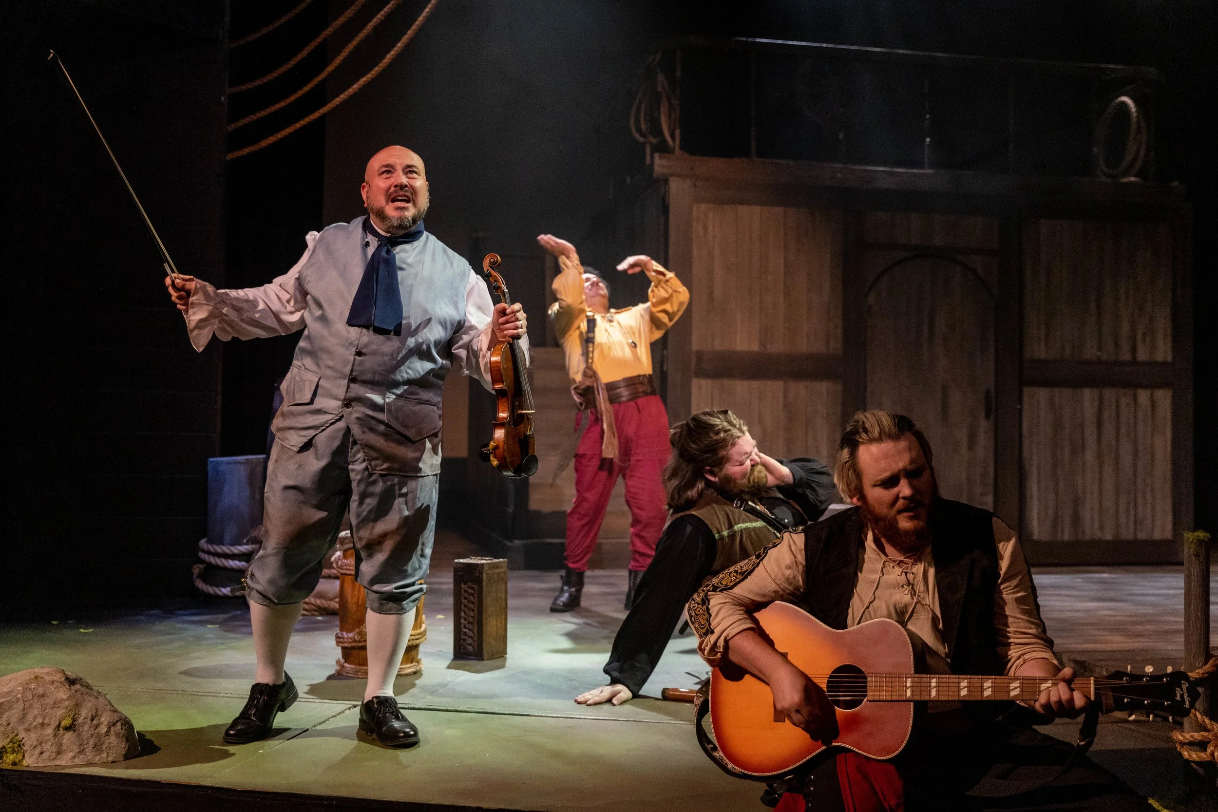 Theatrical performance with four actors; one holds a violin, another plays guitar, a third sits on the ground, and the fourth gestures dramatically. The stage is set with props and wooden structures.