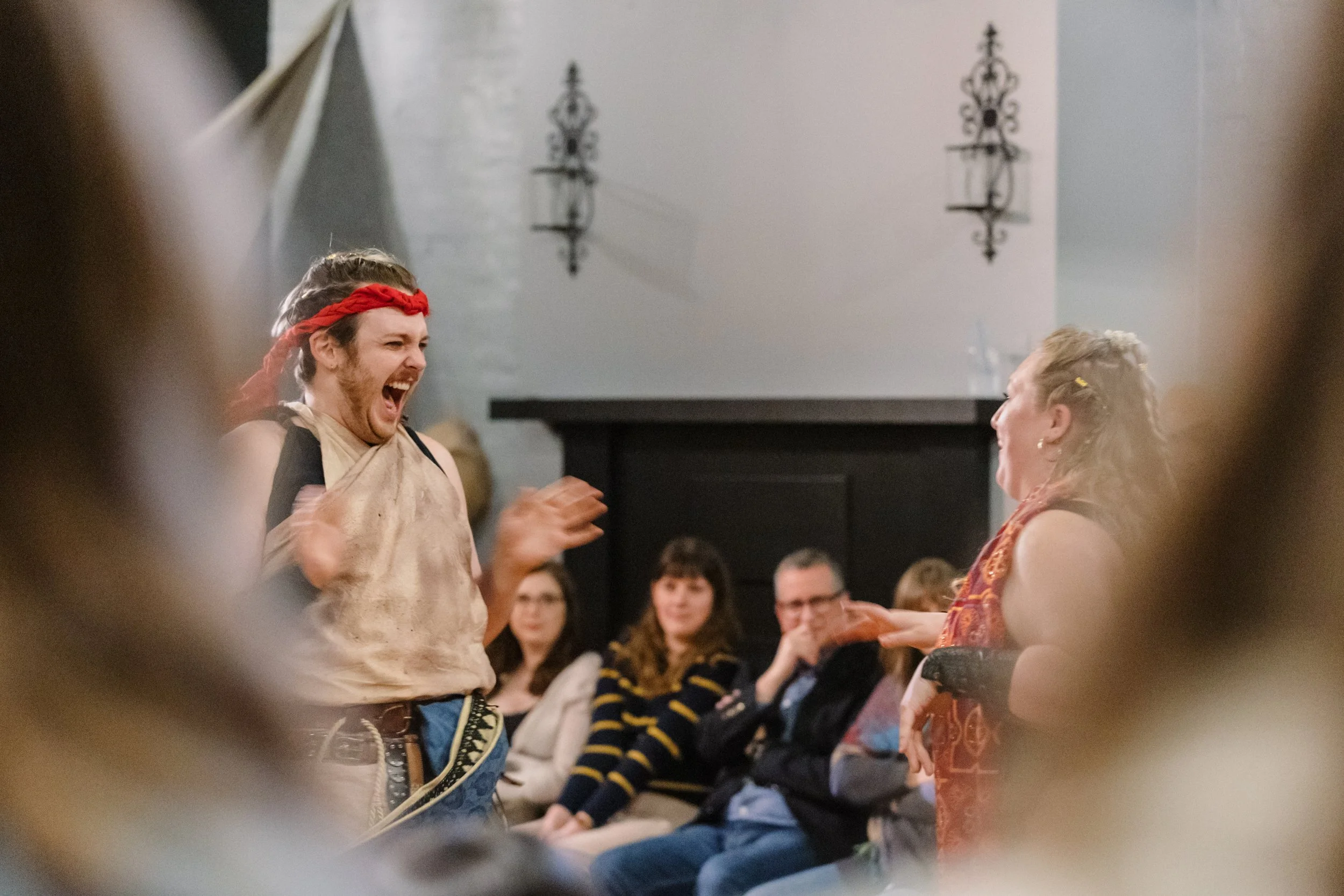 Two actors in medieval-style costumes performing energetically in front of an audience indoors.
