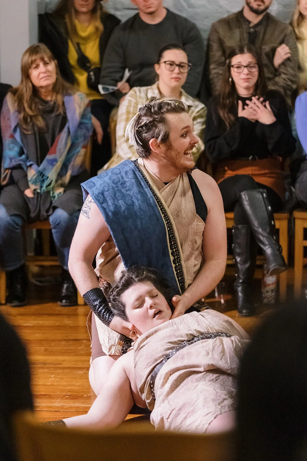 Theatrical performance with actors in period costumes, one holding another on the floor, surrounded by seated audience.
