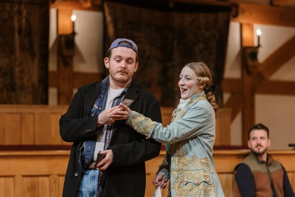 Two actors in period costumes performing a scene on stage