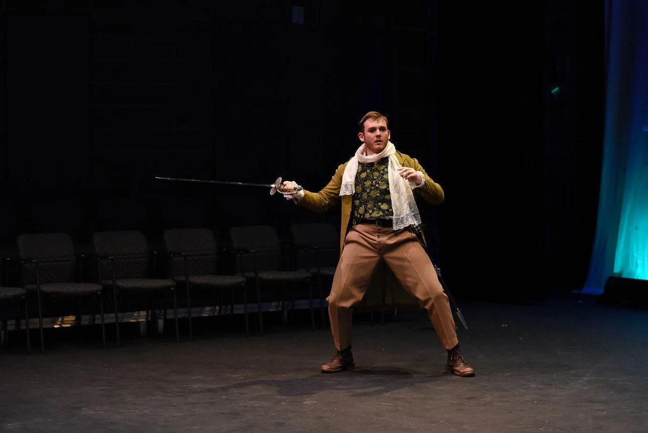 Man in historical costume holding a sword, standing on a stage with chairs in the background.