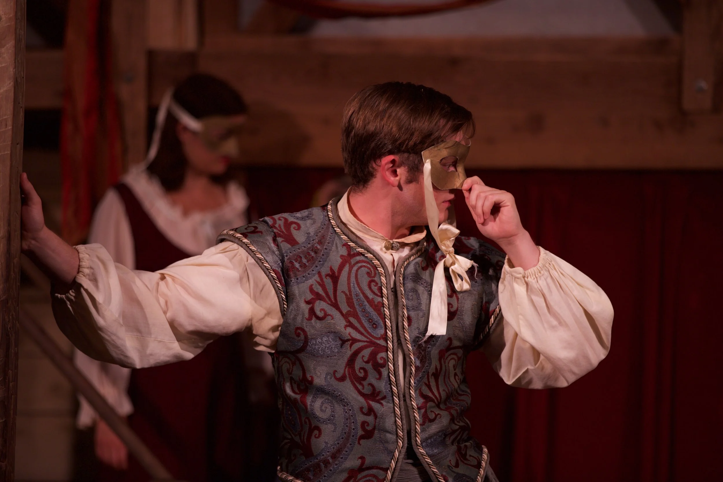 People in period costumes wearing masks, theatrical setting.